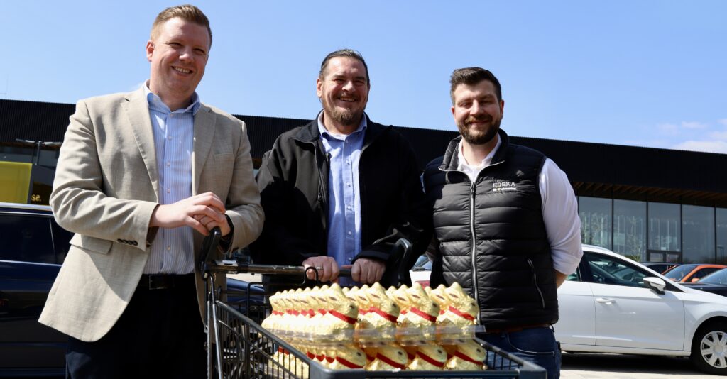 Vertreter von Edeka Südbayern und des Schanzer Kindl bei der Übergabe der Lebensmittelspende für die Osteraktion zugunsten der Villa Johannes