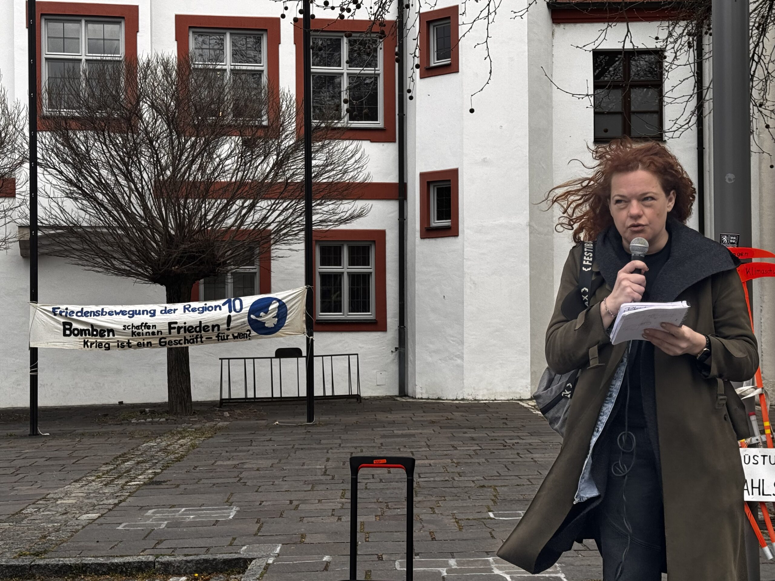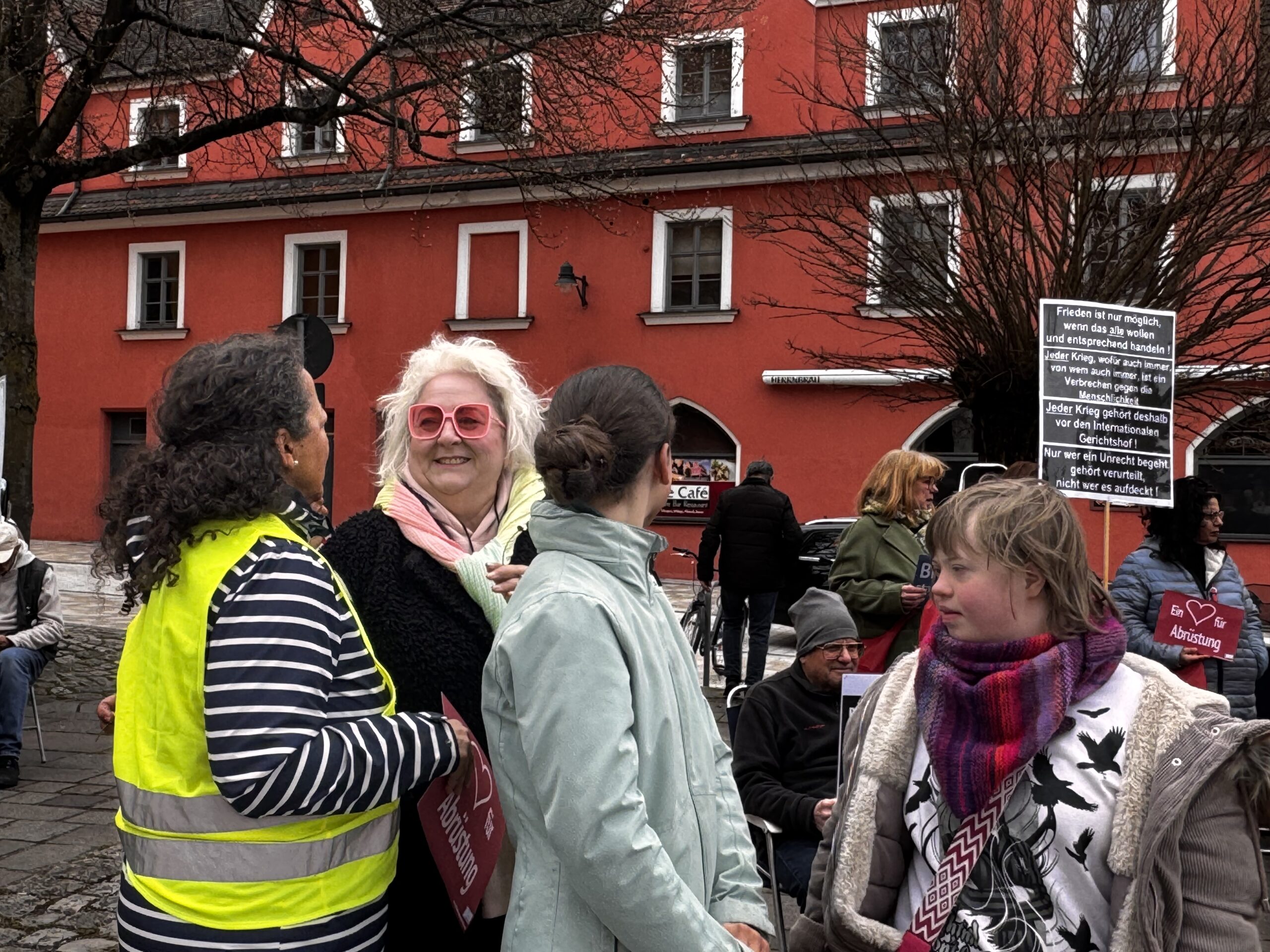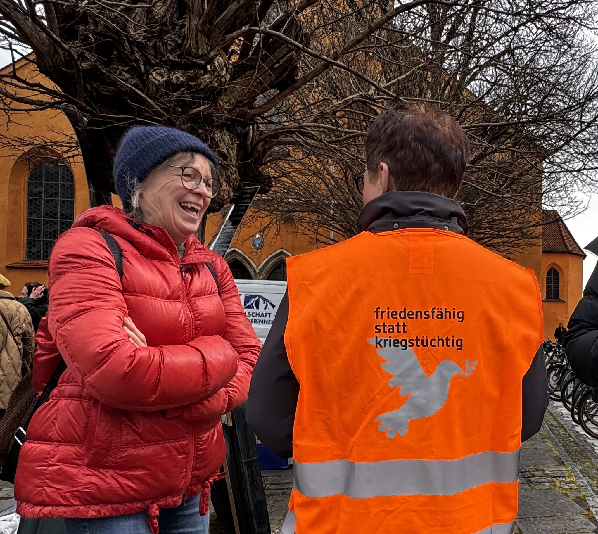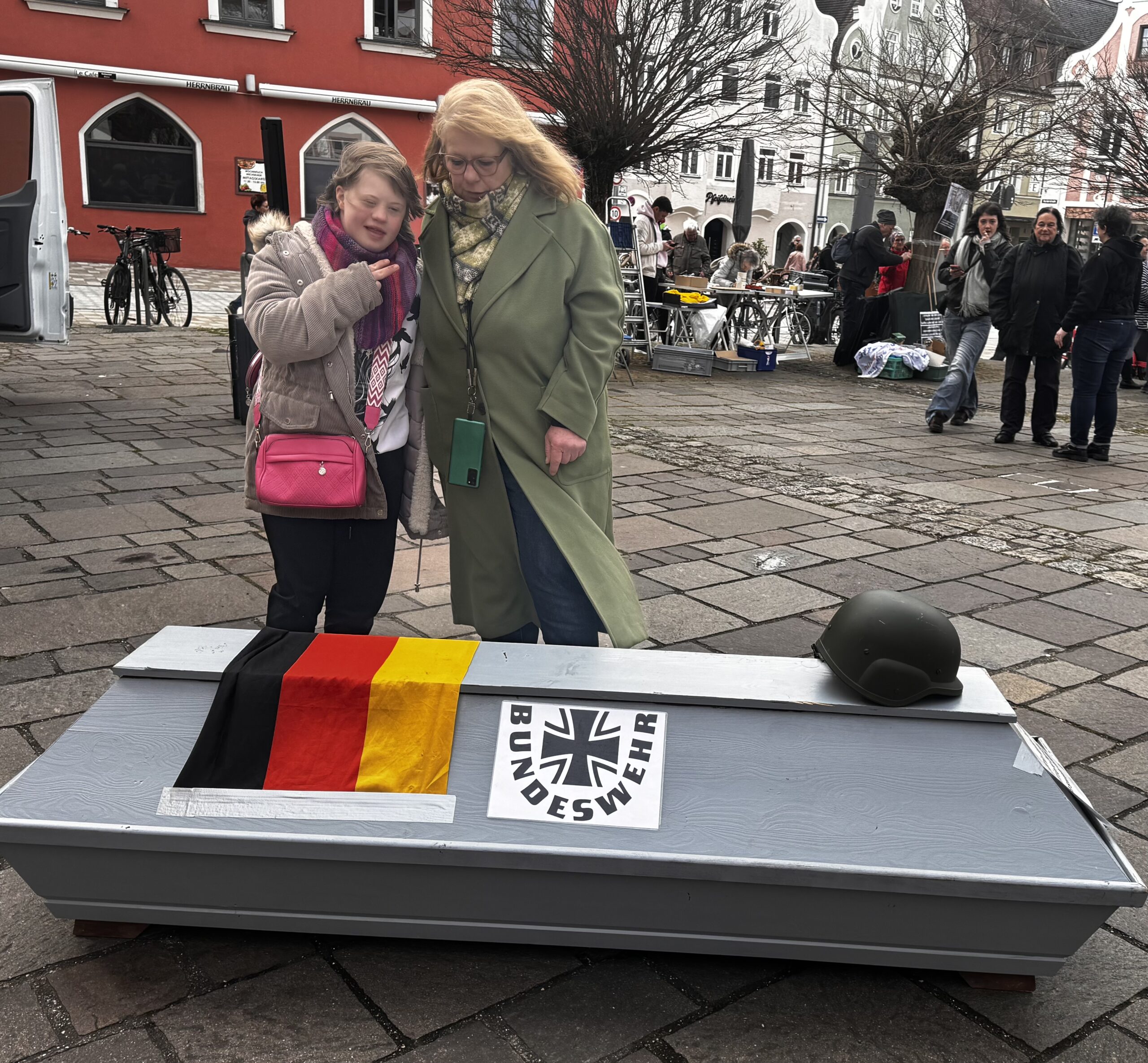 Man müsse sich vergegenwärtigen, dass es im Krieg nicht (nur) darum gehe in den Krieg zu ziehen, um ehrenvoll zu sterben, sondern vor allem darum Menschen zu töten – möglichst viele zu töten. Die Demonstrierenden stehen für das Lebensrecht und Gerechtigkeit für alle – unabhängig davon ob sie und genehm sind oder nicht, ob Freund oder Feind: „ Der Funke der Überheblichkeit, Feindseligkeit und Menschenverachtung darf nicht auf uns überspringen. Wir wollen einen Waffenlosen und entwaffnenden Frieden. Wir wollen Friedfertigkeit lernen. Man werde einen Krieg nicht akzeptieren. Man werde widersprechen. Man werde laut sein und man werde unbequem sein. (HaGa)
