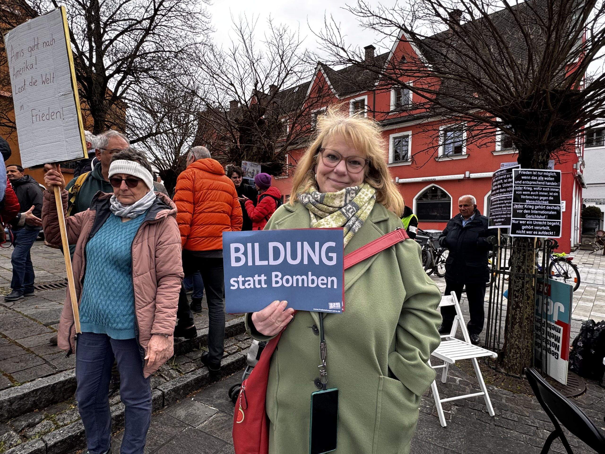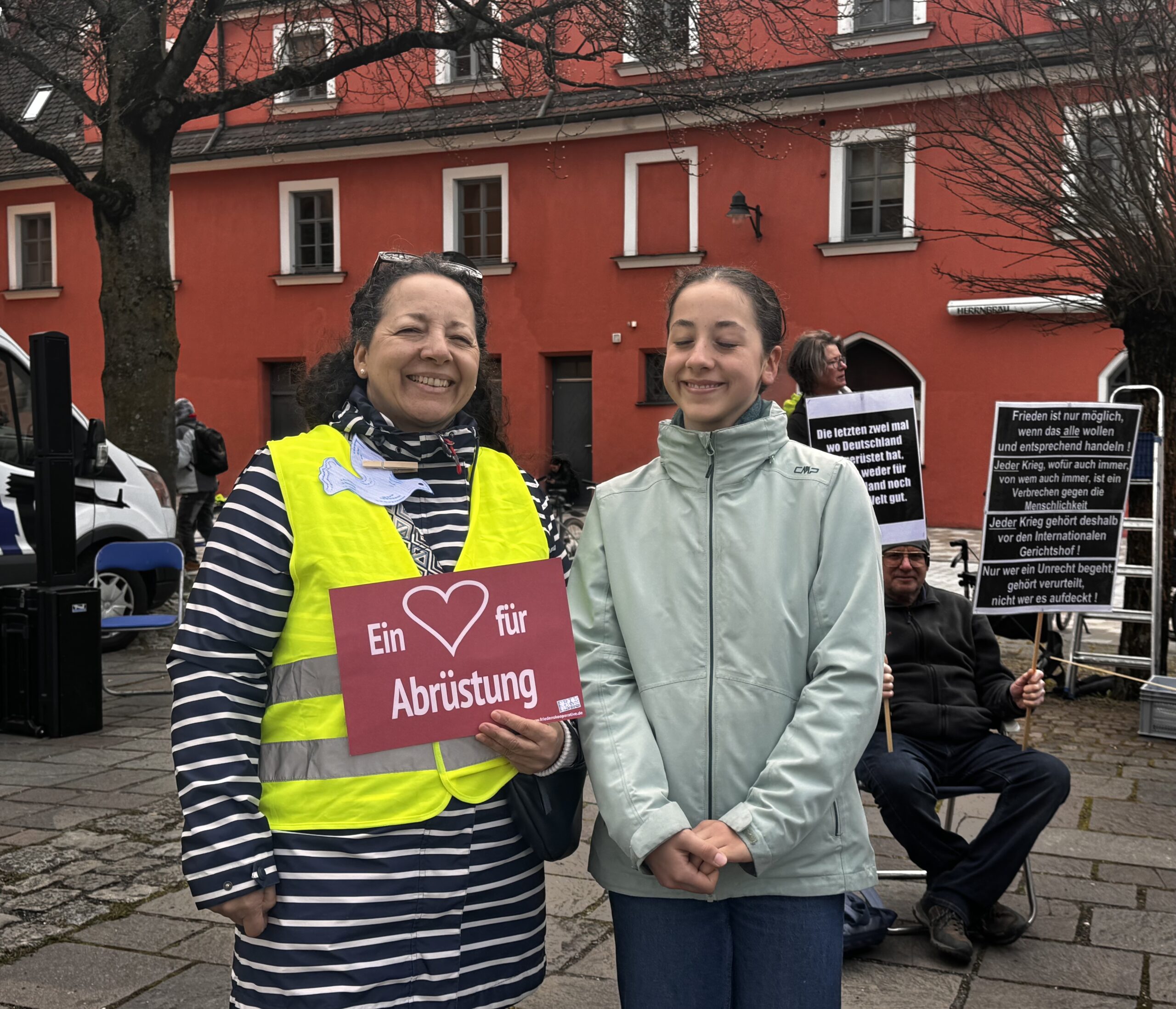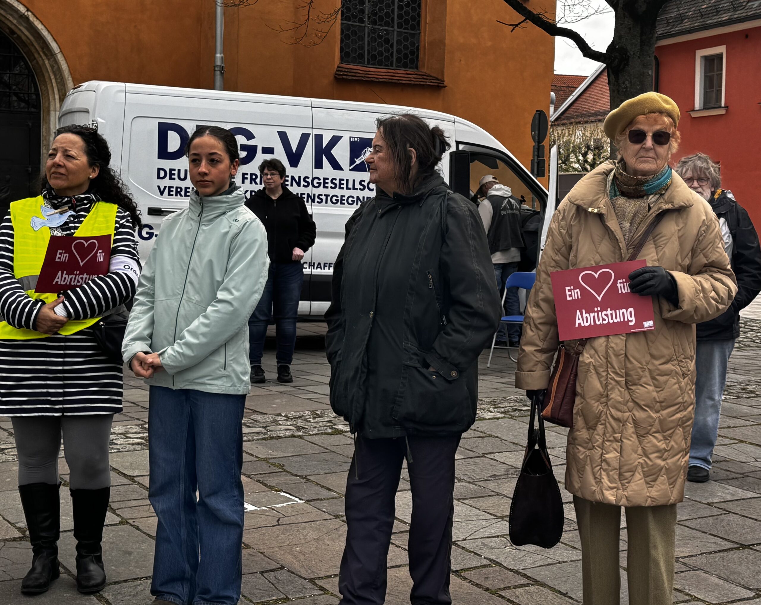 Man müsse sich vergegenwärtigen, dass es im Krieg nicht (nur) darum gehe in den Krieg zu ziehen, um ehrenvoll zu sterben, sondern vor allem darum Menschen zu töten – möglichst viele zu töten. Die Demonstrierenden stehen für das Lebensrecht und Gerechtigkeit für alle – unabhängig davon ob sie und genehm sind oder nicht, ob Freund oder Feind: „ Der Funke der Überheblichkeit, Feindseligkeit und Menschenverachtung darf nicht auf uns überspringen. Wir wollen einen Waffenlosen und entwaffnenden Frieden. Wir wollen Friedfertigkeit lernen. Man werde einen Krieg nicht akzeptieren. Man werde widersprechen. Man werde laut sein und man werde unbequem sein. (HaGa)