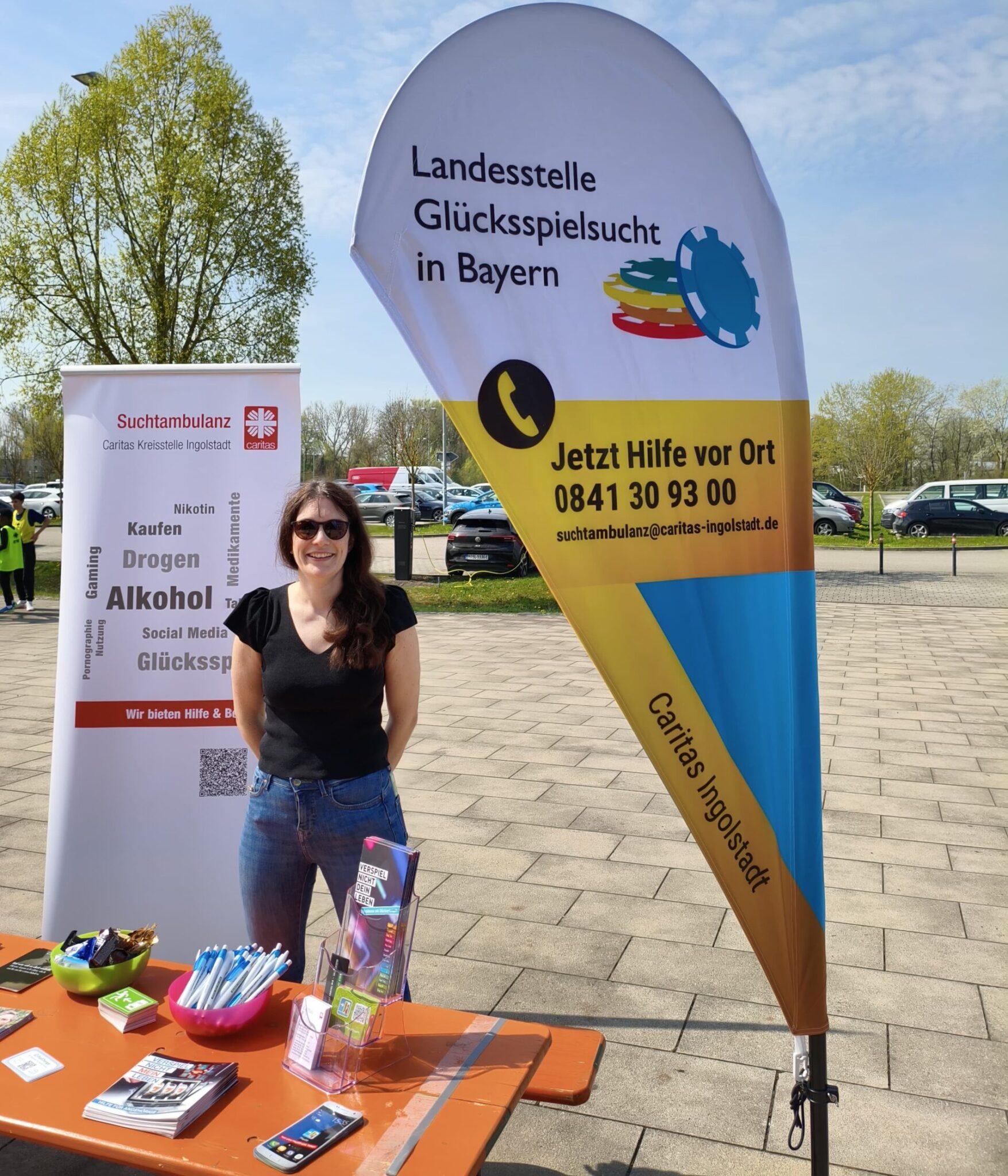 Marie Lehner von der Caritas-Suchtambulanz Ingolstadt bot Beratung und Aufklärung über Glücksspielsucht beim „SchanzerGeber“-Spieltag des FC Ingolstadt 04 an. Foto: Caritas-Suchtambulanz Ingolstadt
