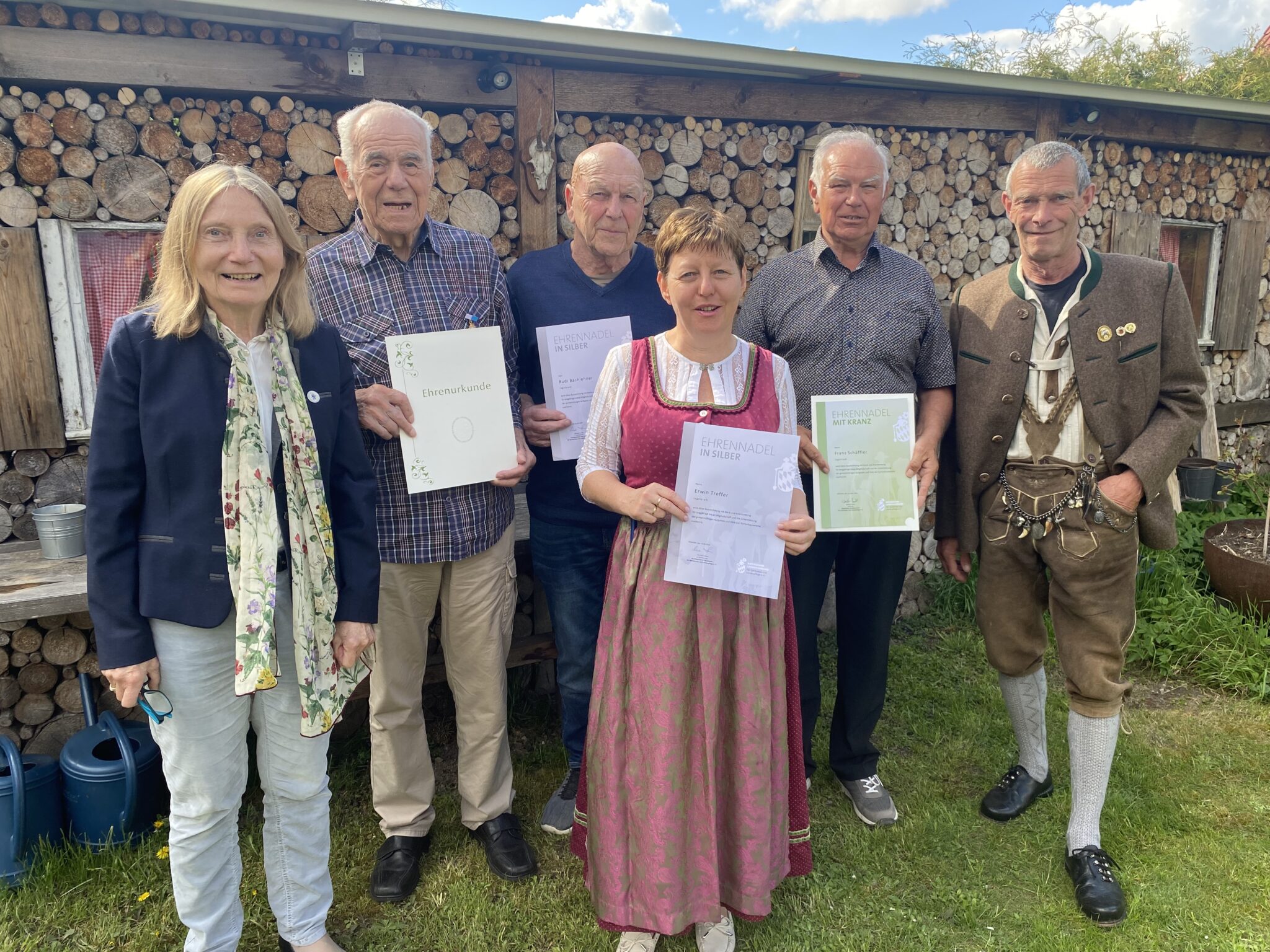 Brigitte Krach (1.Vorsitzende für Gartenbau und Landespflege Ingolstadt), Johann Ferber (60 Jahre Mitglied), Rudi Bachlehner , Anett Treffer (25 Jahre Mitglied) Franz Schäffler (50 Jahre Mitglied), Anton Hemm (1. Vorstand OGV Ober-/Unterhaunstadt),
