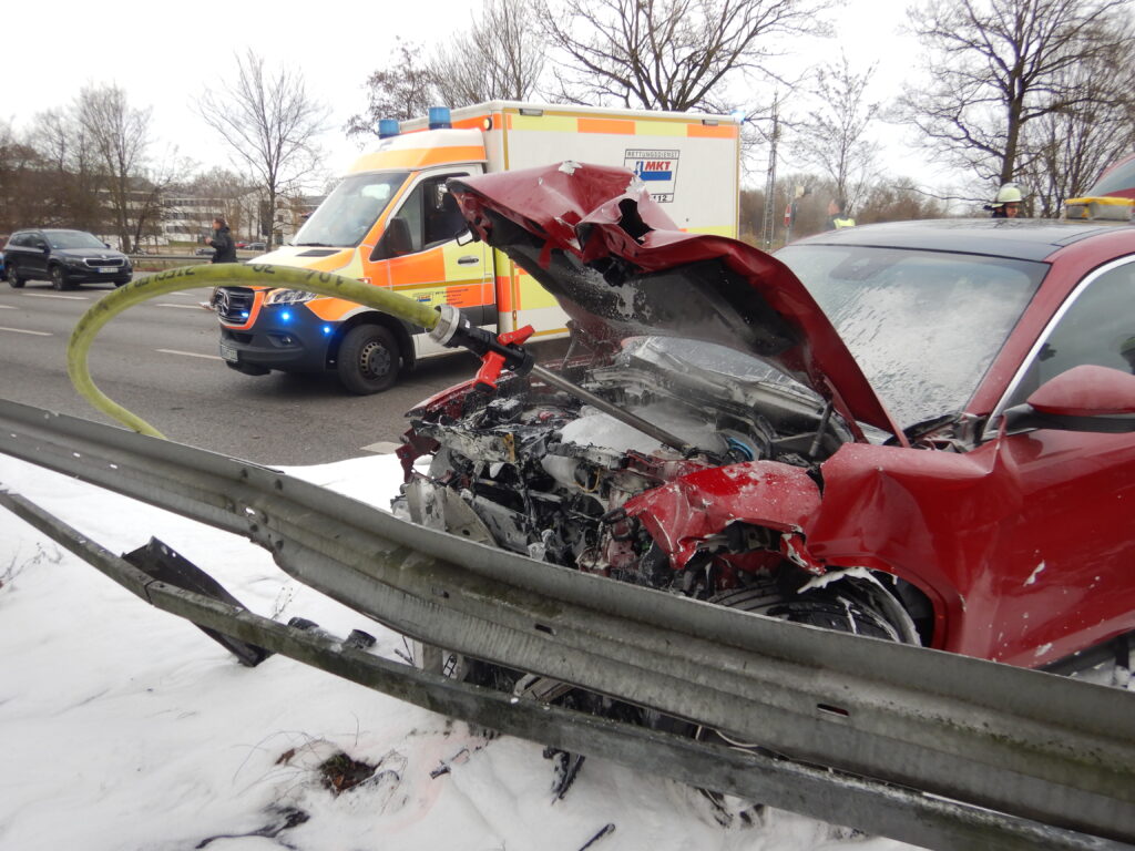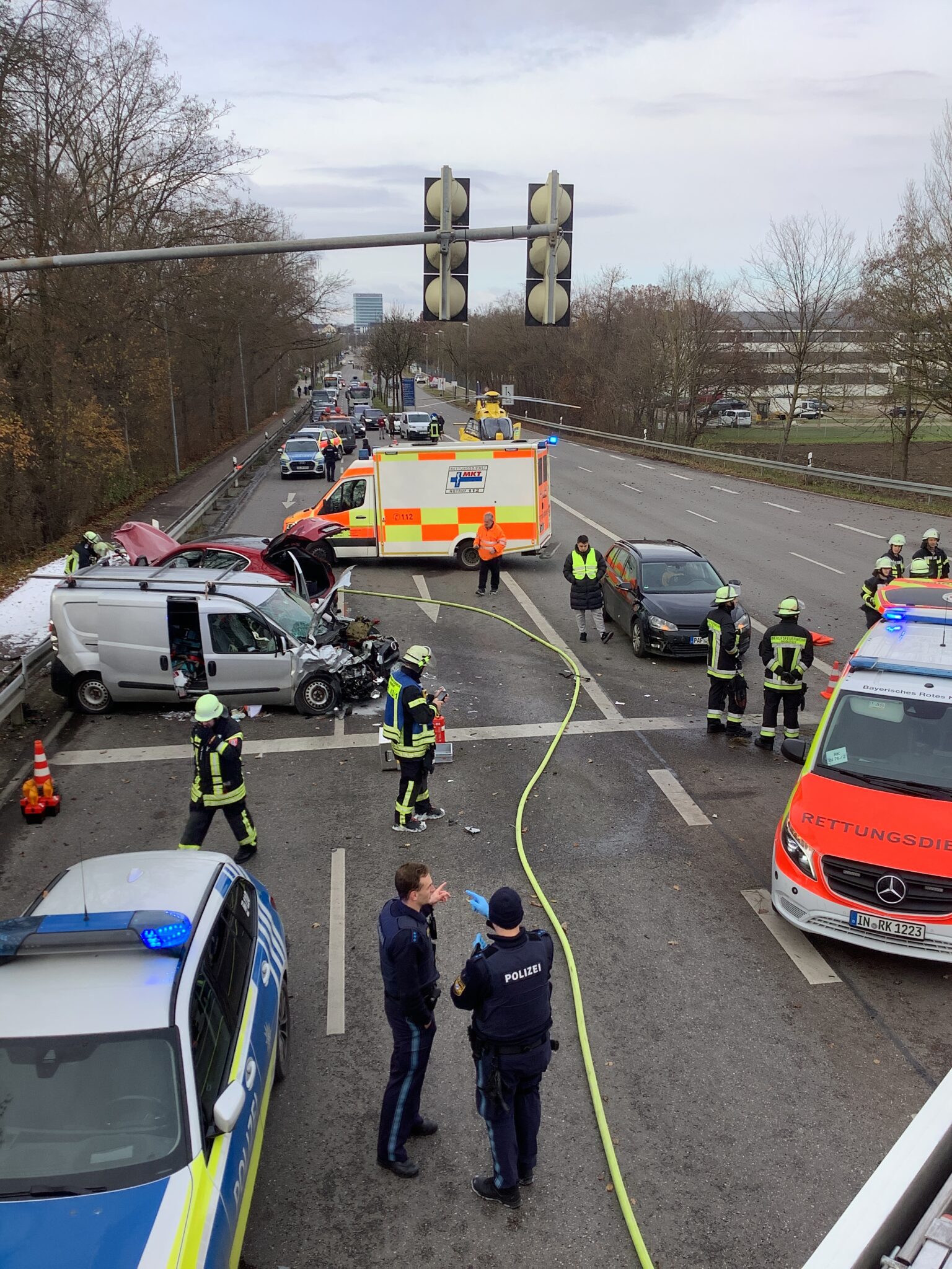 Bei einem schweren Verkehrsunfall mit drei beteiligten PKW auf der Manchinger Straße Höhe der Anschlussstelle Ingolstadt Süd Richtung München wurde eine Person schwer und eine weitere Person lebensgefährlich verletzt. Noch während der Anfahrt wurde das Alarmstichwort für die Berufsfeuerwehr von Verkehrsunfall mit PKW auf Brand PKW angepasst und demzufolge die Freiwilligen Feuerwehren Ringsee, Rothenturm und Unsernherrn nachalarmiert.