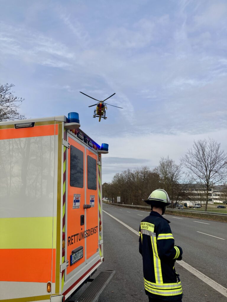 Vor Ort ergab sich folgende Lage: Die Person eines silberfarbenen Kleintransporters befand sich außerhalb des Fahrzeuges und lag mit erheblichen Verletzungen auf der Straße. Die Person im roten PKW saß noch im Fahrzeug, bei dem es zu einem Entstehungsbrand im Motorbereich gekommen war. Der Rettungsdienst leitete mit einem Feuerlöscher bereits erste Löschmaßnahmen ein, welche von der Feuerwehr unter Einsatz von Pressluftatmer und Schnellangriffseinrichtung fortgeführt wurden. Außerdem unterstützte die Feuerwehr bei der Rettung der noch im Fahrzeug befindlichen Person und übernahm bis zum Eintreffen der Polizei die Absicherung der Unfallstelle und verkehrslenkende Maßnahmen.