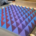 Daher laden sie alle ein unter dem Motto „closed, but open“ jeweils Mittwochs zwischen 10.00- 17.00h in der Tränktorstraße vorbei zu kommen und den Restauratoren über die Schulter zu schauen und mit den Fachleuten auch ins Gespräch zu kommen. Wie der alljährliche Tag der Restaurierung zeigt, ist das allgemeine Interesse an diesem Thema groß, selbst wenn auch da nur ein Ausschnitt dieser Arbeit gezeigt werden kann, denn vieles bleibt trotzdem im Verborgenem: wie präventive Konservierung, Lagerkontrolle oder Inventarisierung. Restaurierung ist eine der wichtigsten Säulen der Museumsarbeit. Am Beispiel des Objektes des Künstlers Hans Jörg Glattfleder wird aufgezeigt, wie komplex die Arbeit ist: Der Farbverlauf der Pyramiden besteht aus Acryl-Siebdruck und reagiert äußerst empfindlich, so dass selbst ein winziger Klebeklecks die Farbe ruiniert hätte. Obwohl der Künstler noch lebt und man im engen Kontakt mit ihm stand, bedurfte es trotzdem einer zweimonatigen, intensiven Recherche, bis man sich an die eigentliche Arbeit machen konnte. Man entschied sich anschließend dafür die Pyramiden nicht mehr zu kleben, sondern zu klammern. Das hat auch den Vorteil, dass im Bedarfsfalle ein einzelnes Element herausgenommen werden kann. Aber auch der Umstand, das Werk auf den Kopf stellen zu müssen, bedeutete wegen der Empfindlichkeit des Materials eine große Herausforderung. An diesem Beispiel wird deutlich, dass Restaurierungsarbeit ein extremes Fachwissen erfordert.