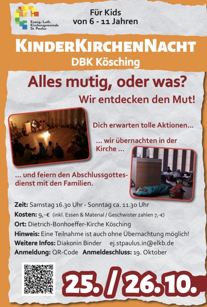 Am 25./26. Oktober 2025 verwandelt sich die evangelische Dietrich-Bonhoeffer-Kirche in Kösching in einen Ort voller Abenteuer, Glauben, Gemeinschaft und Spaß: Die KinderKirchenNacht steht vor der Tür! Das engagierte Team hat ein abwechslungsreiches Programm vorbereitet. Spiele, kreative Aktionen und spannende Geschichten erwarten die Kinder. Ein besonderes Highlight: Die Kinder können in der Kirche übernachten! Wer möchte, kann aber auch ohne Übernachtung teilnehmen.