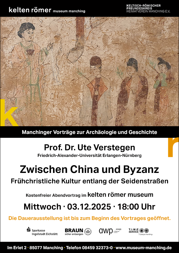Am Mittwoch, den 3. Dezember 2025, laden das kelten römer museum manching und der Keltisch-Römische Freundeskreis Manching e.V. zur letzten Veranstaltung der Reihe »Manchinger Vorträge zur Archäologie und Geschichte« in diesem Jahr ein. Zu Gast ist Prof. Dr. Ute Verstegen von der Friedrich-Alexander-Universität Erlangen-Nürnberg. Sie referiert ab 18 Uhr zum Thema »Zwichen China und Byzanz – Frühchristliche Kultur entlang der Seidenstraßen«.