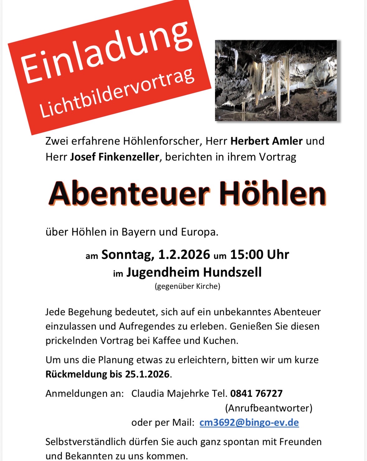Am Sonntag, 1. Februar 2026 um 15 Uhr laden die Höhlenforscher Herbert Amler und Josef Finkenzeller zu einem Lichtbildvortrag unter dem Titel „Abenteuer Höhlen“ ins Jugendheim Hundszell ein. Gezeigt werden beeindruckende Einblicke in Höhlen in Bayern und Europa. Im Anschluss gibt es Kaffee und Kuchen.